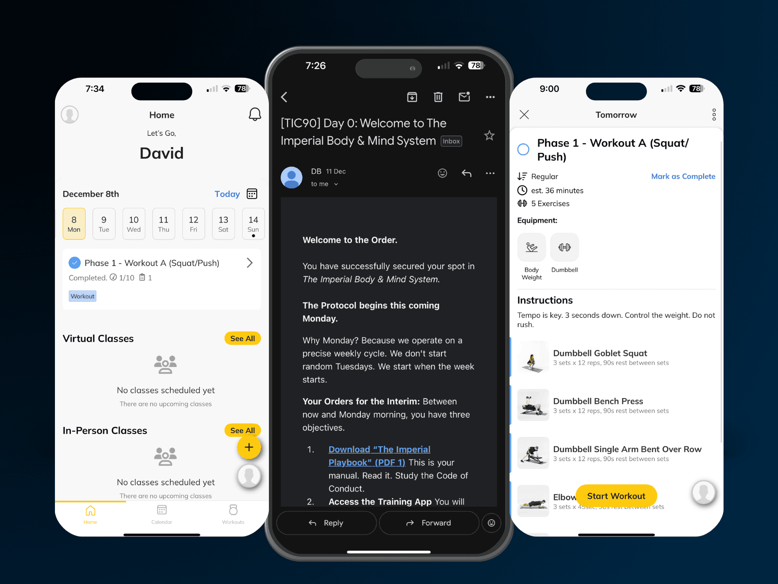 Phase 2: Reconstruction – We install the foundational protocols: the Imperial Landing Strip (friction-free morning routine), 10-30 minute strength sessions, flexible nutrition framework, and backup protocols for "bad days" (because there will be bad days.)